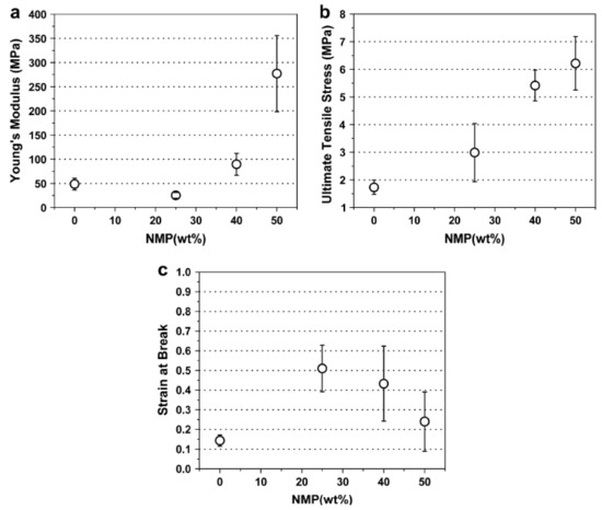 Mechanical properties of electrospun PES membranes as a function of the mixed solvent: (a) Young’s modulus, (b) ultimate tensile strength, and (c) strain at break. Provided with permission from Elsevier [34].