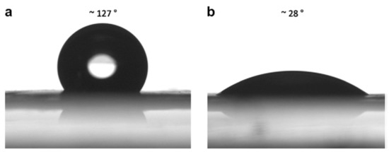 Water contact angles for oxidized (a) and untreated (b) electrospun PES membranes. Provided with permission from Elsevier [34].