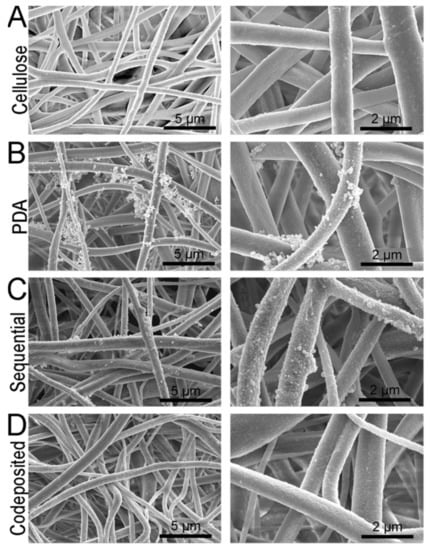 (A) SEM micrographs of the cellulose nanofiber mats used as the base materials for this study. The morphologies of (B) PDA and (C,D) polyMPC/PDA (sequential and co-deposited) functionalized nanofiber mats are also displayed. Provided with permission from American Chemical Society [130].