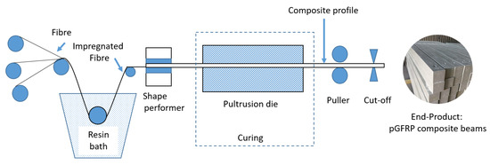 Schematic diagram of pultrusion process of glass fibre/UPE composite beams.