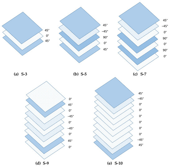 Stacking sequence of pGFRP composite samples such as (a) S-3, (b) S-5, (c) S-7, (d) S-9 and (e) S-10.