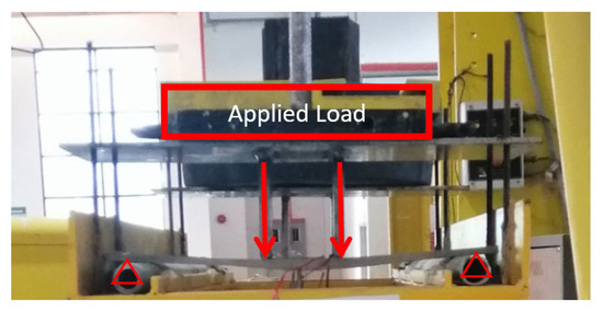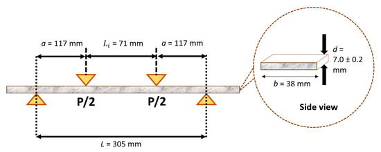 The flexural test was executed using a 4-point bending method in accordance with the international testing standard, ASTM D6272, as shown in Figure 3. This is to ensure that the sample is subjected to constant flexural stress at the sample midpoint. The test was conducted using a Universal Testing Machine (Instron, Norwood, Massachusetts, USA) at the Material Laboratory, Universiti Tenaga Nasional, Malaysia. This experiment was expected to evaluate the ultimate flexural strength with a crosshead speed of 3.29 mm/min. The diameter of the loading channel was set at 2.5 mm with a support span length of 305 mm and 12.7 mm of diameter support roller. The setup of the experiment involved the span-to-depth support ratio of 29 with the span-to-depth shear ratio being approximately 10.45. This technique was employed since it was compatible with the ASTM D6272 criteria and slender enough to decrease shear effects. The dimension of the specimen was set at 320 mm × 38 mm, and each sample configuration was replicated three times. The sample thickness was 7.0 ± 0.2 mm. The end results were averaged and recorded for analysis and discussion. The ultimate flexural strength of pGFRP composites was calculated using Equation (1):