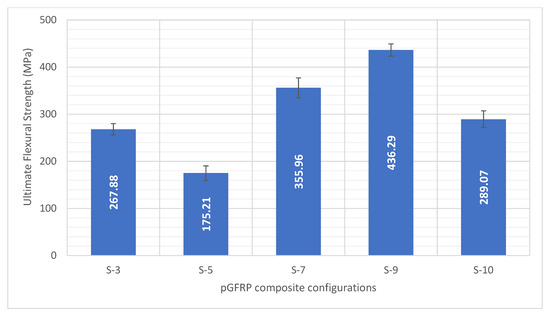 In this experiment, the ultimate flexural strengths of S-3, S-5, S-7, S-9, and S-10 of pGFRP composites were evaluated. In Figure 5, the flexural strength of S-3 to S-5 pGFRP composites decreased, but at S-5 to S-9 configurations, the flexural strengths increased to the maximum, which was 289.07 MPa (S-9 pGFRP composite). Based on the results, the highest flexural load was seen at S-9 sample at 2759 N, while the lowest value of flexural load was recorded by S-5 sample. In conjunction with these results, the highest ultimate flexural strength recorded was S-9 (436.29 MPa) as shown in Figure 5.