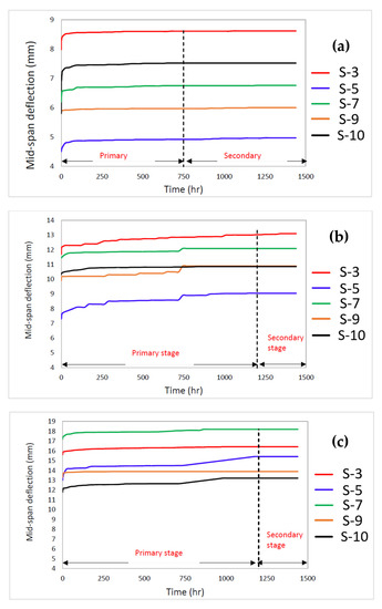Figure 6a shows that the initial deflection of S-5 sample is the lowest deflection compared to others at the 12% load level. This was probably due to the S-5 sample which exhibited the lowest ultimate flexural strength among all other samples as displayed in Figure 5. For Figure 6b,c, S-3 and S-7 are the highest deflection for 24% and 37% load levels, respectively. The inconsistency on the deflection of the sample may be due to different thickness of each configuration as well as the number of fibre layers. Besides that, the results illustrated that the S-9 sample had lesser deflection increment in comparison with other pGFRP composite samples. It can be deduced that the ability of the S-9 sample can resist the sustained load without additional deflection, which indicated that it probably had a longer lifespan. According to Fotuohi et al. [75], the alternation between 0° and ±45° of the ply orientation results in varied stiffness along the thickness of the laminates, which causes the S-9 sample to have better less creep strain rate. In this case, an optimised layering sequence plays a significant role towards high performance of structural applications [44,45,86]. At the end of this study, the secondary stage at 1440 h was selected in determining Findley’s parameter as well as the reduction factor.