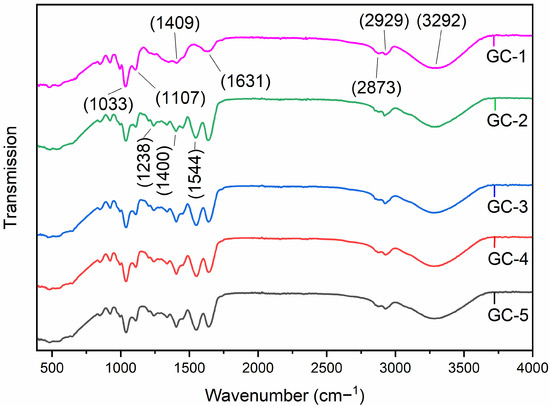 Fourier-transform infrared (FTIR) analysis of the edible films (GC-1–GC-5).