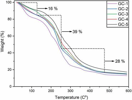 Thermogravimetric analysis of the edible films containing varied concentration of gallic acid; GC-1, GC-2, GC-3, GC-4, and GC-5.