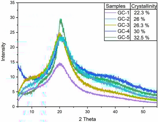 XRD analysis of the gallic acid-added gelatin–casein-based edible films; GC-1, GC-2, GC-3, GC-4, and GC-5.