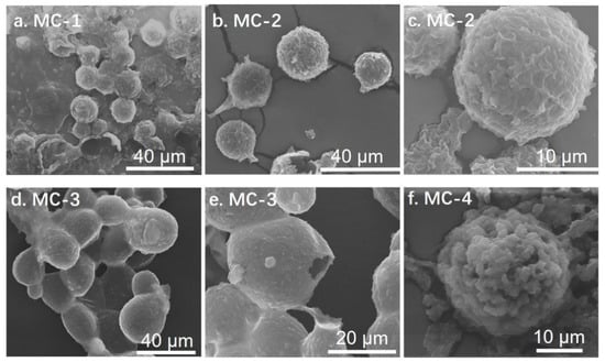 The surface morphology of the GO microcapsules was observed with a higher magnification, as shown in Figure 1c,e,f. The wrinkles on the surface of MC-2 resembled the morphology of GO. The self-assembly of GO at the oil/water interface in the Pickering emulsions led to the formation of microcapsule shells [16], driven by the decrease in the interfacial energy (ΔE) in Equation (1) [18]. The microcapsule surfaces became smooth for MC-3. The oil phase in the Pickering emulsions was the mixture of BTA and 2020A. The BTA molecules had higher hydrophilicity than 2020A, so BTA tended to migrate to the water/oil interfaces according to the phase separation principles [7]. Graphene-based materials had strong absorption properties [26]. As a result, BTA promoted the formation of the GO microcapsules by interacting with GO at the interfaces, which in turn provided a robust encapsulation of the core materials. With an increase in the BTA content, the wrinkles of GO were covered for MC-3. The accumulation of BTA at the microcapsule surfaces resulted in the rough surfaces for MC-4. When the content of BTA was further increased, the Pickering emulsions were no longer stable due to the decreased γo/w in Equation (1) [18]. In contrast, the microcapsules cannot be formed for MC-0 without the assistance of BTA.