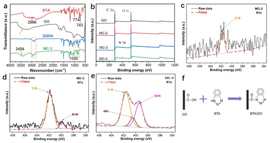 The FTIR (a) and XPS (b) spectra of the GO microcapsules. High-resolution XPS scans of N1s for MC-2 (c), MC-3 (d), and MC-4 (e). Reaction scheme of GO and BTA (f).
