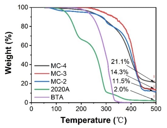 The loading capacity of the GO microcapsules were evaluated according to the TGA results in Figure 3. The decomposition of 2020A started at around 120 °C with a residual weight of 2.0% upon heating to 500 °C. BTA barely showed any residual weight at above 370 °C. The loading capacity of the MC-2 was estimated as: 1 − (11.5% − 2.0%) = 90.5%, neglecting the weight loss from the thermal reduction of GO. Similarly, the loading capacity of MC-3 and MC-4 was calculated and listed in Table 1. With an increase in the BTA content, the loading capacity of the GO microcapsules was slightly decreased. It was speculated that the amount of entrapped GO layers at the interface would increase with the BTA content, resulting in the slight decrease in the loading capacity as well as the increase in the microcapsule diameter.