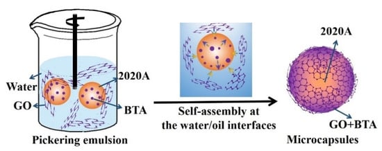 The formation process of the GO microcapsules is illustrated in Figure 4. GO was dispersed in the water phase, while BTA was dispersed in 2020A (oil phase). Upon high shear mixing, the Pickering emulsions were obtained when the GO layers assembled spontaneously at the oil/water interface due to the amphiphilic feature of GO. Meanwhile, BTA molecules also migrated to the interface from the oil phase, driven by the relatively high hydrophilicity of BTA, compared to 2020A. Then, the amidation reaction (Figure 2f) occurred between GO and BTA, which assisted the robust encapsulation of the self-healing agent. An excessive amount of BTA can be carried physically on the microcapsule shells, as proven by Figure 1f and Figure 2e. The physical and chemical interactions between BTA and GO provided the microcapsule shells with the corrosion inhibition properties, so the microcapsules can be considered as a unique albumen-yolk-like structure.
