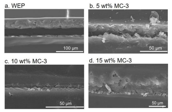 After scratching, the Icorr value of WEP coatings increased to 1.68 × 10−6 A cm−2. The composite coatings with different contents of MC-3 were healed after 48 h (Figure 5b). The Icorr values decreased with an increase in the content of MC-3 (Table 3) and the HE was calculated as 99.7% and 99.9% according to Equation (2), respectively, when the content of MC-3 was 10 wt% and 15 wt%. Figure 6 shows the morphology of the healed coatings. The release of the healing agent 2020A was triggered by crack-initiation and the cracks with a width of around 30 μm were filled up when the content of MC-3 was above 10 wt%, which was consistent with the results of the Tafel tests (Figure 5b).