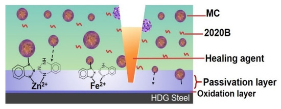 The effects of dual functional microcapsules are schematically shown in Figure 7. The self-healing properties were realized by the release of 2020A from the microcapsules and the curing reaction between 2020A and the dispersed 2020B. In addition, BTA on the shells of the GO microcapsules can either capture the metal ions in the coatings, or migrate to the metal/coating interface and form a passivation layer. The electrochemical process of corrosion reaction would be inhibited by the capture of metal ions and the formation of a passivation layer [29], which are independent of the breakage of the microcapsules.
