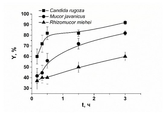 Our testing of protein binding with polysaccharide hydrogel showed that lipases immobilize rather well in the κ-carrageenan matrix (Figure 1). It was revealed that the high percentage of enzymes remain in hydrogel microcapsules for several hours with the immobilizing efficiency of 25, 35, and 37% for lipases Candida rugosa (CR), Mucor javanicus, (MJ) and Rhizomucor miehei (RM), correspondingly. The analysis of protein release curves showed that the largest CR lipase has the fastest release. This means that the protein size and mesh size of the polysaccharide network are not decisive for this process. The quantitative estimation of protein activity highlighted that protein remains catalytically functional in the immobilized state or after immobilization, but we cannot distinguish the investment from entrapped and released species and do not further discuss these characteristics here.