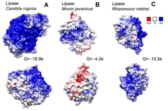 The surface charge simulation of lipase from Candida (A), lipase from Mucor javanicus (B), and lipase from Rhizomucor miehei (C). For every protein, the view of opposite surface is shown above and below.