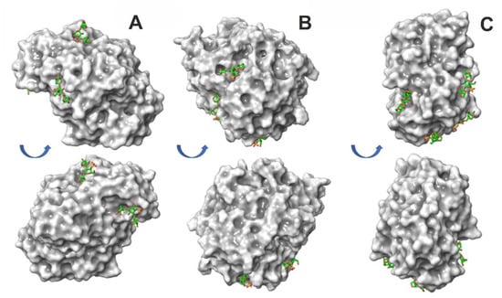 To determine the protein surface epitopes for κ-carrageenan binding, fragment-based molecular docking was performed. In this approach, a natural long chain of polysaccharide was divided into short representative fragments, then these short fragments were docked to protein molecules. This procedure allows a decrease in the extremely high conformational variability of the polymer chain, which is typical for long polysaccharides and impossible to grasp in silico. The docking poses of short polysaccharide oligomers indicate the most probable sites of polysaccharide–protein binding and, at certain conditions, may help to trace the orientation of real polysaccharides in respect to protein molecules. Earlier, the trisaccharide fragment was shown to be efficient at tackling the binding sites of oligomers for up to dozens of sugar residues (e.g., 24 residues of κ-carrageenan can interact with one lysozyme molecule) [,]. However, in the three lipases studied in this work, the docking poses of the κ-carrageenan trisaccharide were rather isolated (Figure 3). This implies that it is unlikely that those rather extended epitopes are capable of binding longer polysaccharide fragments determined for lysozyme [,] and binase []. In the lipases studied here, the interactions with the κ-carrageenan chain are rather stabilized by the point contacts with short polysaccharide fragments, which are up to three saccharide residues.