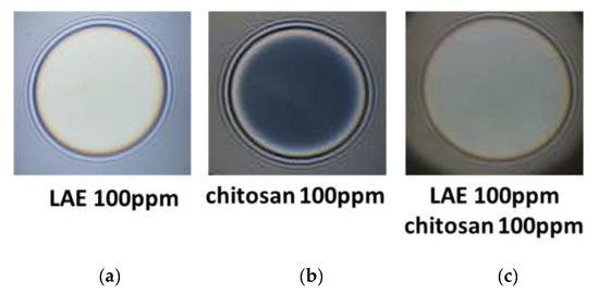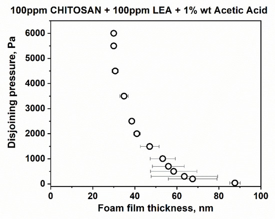 Figure 2 presents typical snapshots of microscopic foam films from aqueous solutions of lauroyl ethyl arginate 100 pp, chitosan 100 ppm in the presence of 1%wt acetic acid and the mixture of lauroyl ethyl arginate 100 ppm with chitosan 100 ppm in the presence of 1%wt acetic acid. There is a well-outlined difference between single-component and mixed solutions. In the case of the lauroyl ethyl arginate 100 ppm solution (Figure 2a), only unstable thick films are formed. Some of the chitosan-only solutions’ films are stable and have an equilibrium thickness of 52 ± 4 nm (Figure 2b); they rupture at a critical pressure of Pcr~90 ÷ 105 Pa and h = 29 ÷ 30 nm. Another portion of the films is less stable and ruptures at Pcr~15 Pa and at equilibrium thickness values. However, the films of LEA and chitosan mixtures are stable with equilibrium thickness values of 84.4 ± 3.5 nm (Figure 2c); critical pressures reach Pcr~6000 Pa, and the critical film thickness values are h ~ 30 nm (Figure 3).