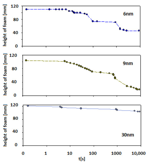 In the case of smaller particles (Levasil®s 500/15% and 300/30%—ca. 6 and 9 nm, respectively) also, stable foams were observed (at least half of the initial height of foam was still observed after 15 min of the experiment). However, after this ageing period, the foam started to disappear to less than 20% of the initial foam column height for 6 nm particles and 40% for 9 nm particles, respectively.