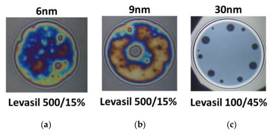 Figure 6 presents snapshots of microscopic foam films obtained from the mixtures of chitosan 100 ppm, LAE 100 ppm cationic surfactant, and acetic acid 1%wt. with various kinds of Levasil®s. Nanoparticles with a size of 6 and 9 nm lead to the formation of rheologically very stable, thick and heterogeneous films in which there was practically no liquid drainage (Figure 6a,b).