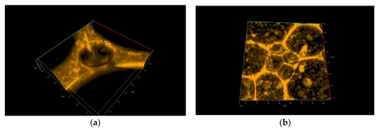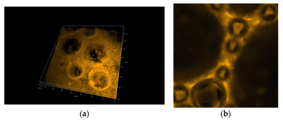 Confocal microscopy photo of the foam generated from the chitosan—LAE—Levasil® 100/45% (30 nm) mixture—3D structure (a) and 2D photo (b).