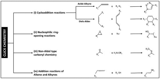 The scheme shows the classification of click chemistry reactions into four main categories. The scheme has been reproduced from another article [13] with permission from Elsevier, 2022.