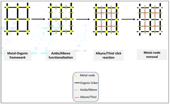 In 2020, Hassan et al. published an excellent review article discussing the construction of hierarchical structures from MOF (Metal/covalent Organic frame) using click chemistry (Figure 5) [16]. The significant potential of clickable MOF for building high precision hierarchical structures, porosity control, the transformation of internal and external structures and post-synthesis modifications (PSM) opened a new horizon in the field of bio/material science.