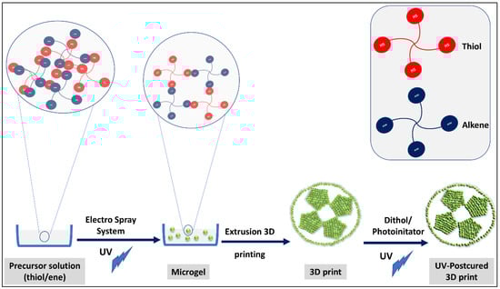 Clickable PEG hydrogel microspheres as building blocks for 3D bioprinting. The illustration is based on the work conducted by [17].