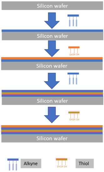 At the same time, the use of orthogonal click chemistry with LBL assembly allowed for an efficient control of microporosity and wettability of the fabricated nanofilm [30]. The procedure basically combines thiol–yne click chemistry with lithographic techniques (mask) to produce such structures.