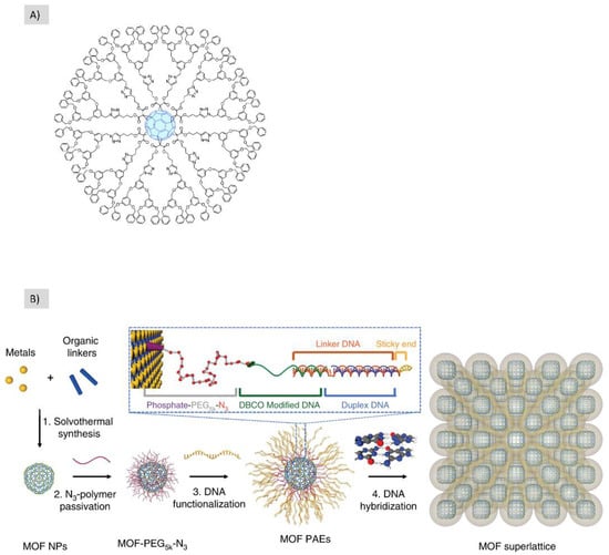 The use of soft/hard nanobuiling blocks to fabricate hierarchical structures using click chemistry. (A) Fullerene is used as the core for the formation of this dendrimer, (B) the polymeric nanoparticles and DNA are coupled using an azide/alkyne click reaction followed by DNA hybridization to form the final hierarchical structure. These figures have been reproduced from other articles [54,58] under a CC−BY license.