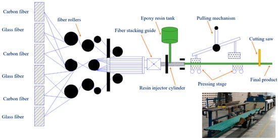 In this study, a hybrid composite tube with a combination of carbon fibre and glass fibre with a 30 ± 2% volume fraction of each kind was used as the filler for an epoxy resin. The inner diameter of all the samples was considered to equal 34 mm and the thickness of the tubes was kept at 2 ± 0.1 mm. The tubes were made of 16 layers consisting of a combination of carbon and glass fibres. The volume fraction of the matrix was 40% and the rest was made up of the fibres. In this study, the volume fraction of fibres has an equal value for GFRP and CFRP of 30%. The composite tubes have unidirectional fibres, and the tubes were made through the pultrusion process. The pultrusion machine can make composite tubes with single or various kinds of fibres. Moreover, by changing the extruder die cross section, different cross sections and diameters can be manufactured. However, investigation of the effect of different fibre volume fractions and different layer configurations can be examined in future studies. The final product from the pultrusion machine is the composite pipe of 3m length. The tubes can be sized by a diamond saw at a specific length. The burn test was applied to five random samples to verify the repeatability of fibre volume fraction. Figure 1 shows the schematic view of the pultrusion processing method.