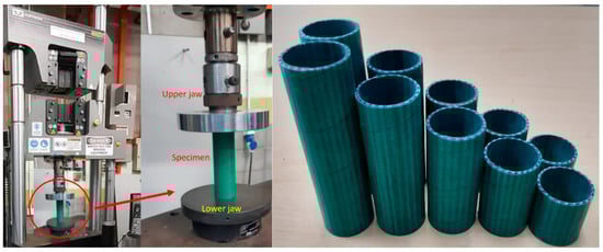 The samples were cut in 5 different aspect ratios, i.e., 1, 1.5, 2, 2.5, and 3. To avoid early-stage failure, it should be considered that the upper and lower surfaces should be completely flat. The samples were used in an INSTRON universal testing machine with 100 kN load cell capacity. The loading rate was set as 5 mm/min. For each test, five samples were prepared. In this study, the thickness and hoop diameters were kept constant and only the length variation was examined. The setup of the experiment and tube sample with different aspect ratios were shown in Figure 2. Setup of experiment and tube sample with different aspect ratios. Table 1 shows some general information about the fibres and matrices used in this study.