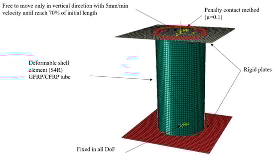 An FE model was developed in ABAQUS/Explicit solver. The deformable bodies generated by shell elements (S4R) and two analytical rigid plates were created as the fixed and moving compression machine shoes. A reference point was assigned to the top rigid body and a 5 mm/min velocity was assigned to it. The simulation was stopped when the maximum displacement reached 70% of the initial length. The quality of mesh was verified using two methods. Firstly, the geometrical parameters of the mesh, e.g., aspect ratio and element skew angle were controlled and after obtaining good results a mesh convergence study in a single model was applied and the size of elements was selected for all the case studies [45]. In order to get accurate results and satisfy the quasi-static loading requirements, the balance of energy terms was applied. The total energy should be less than 5% of the subtraction of kinetic energy and internal energy to justify the result of the simulation [46]. The material properties were taken from the experimental test that was reported in Table 1. To model the combination of different fibres in a single matrix, a macro-mechanical approach considering the overall behaviour of specimens was utilized. To study the damage behaviour of structure, Hashin’s damage model was used to model the failure of tubes under axial loading [42]. A surface-to-surface contact penalty method with a 0.1 friction coefficient was applied between the tube end and the rigid plates. In addition, a self-contact to avoid self-penetration of tube walls was applied to the tubes. Figure 5 shows the FE model, applied load, and boundary conditions.
