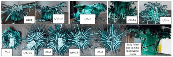 Crashworthiness indicators, i.e., the EA, SEA, Fmax, and CFE were investigated in this study for different aspect ratios. The results of the experimental procedure were used to check the validity of the FE results. The deformed shape of experimental test samples for different aspect ratios is shown in Figure 6. Pre-buckling, buckling, and post-buckling are the three main stages of progressive collapse that can be observed for all samples under axial compressive loading [42]. In the pre-buckling stage, the composite tube remains elastic and has no bending. Gradually, the damage initiates and after reaching the first peak load the buckling stage is initiated and is indicated by a constant or drop in the magnitude of the load. In the buckling mode, the force will be maintained almost at a certain level and every folding and progressive collapse will cause holding of the force at the maximum possible level. The value of CFE indicates the performance of the buckling stage. In the post-buckling mode, the structure has no resistance, and it will collapse with minimum force. This can be named a completely failed structure. The experimental samples show a suitable bonding between carbon fibre, glass fibre, and the epoxy matrix. Unlike other manufacturing methods, such as filament winding and hand layup, the pultrusion method does not experience delamination and debonding in the hoop direction. However, in the fibre direction, some initial cracking was observed and at the onset of the test the crack was propagated, and sudden breakage was detected. This phenomenon was related to the manufacturing process and could be solved by changing some factors in the process, such as the feed rate of the machine and curing time of the specimens.