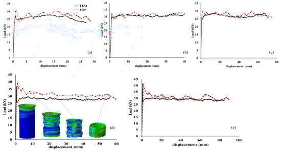 Figure 7a–e demonstrates the results of load-displacement curves for different aspect ratios of composite tubes. Only the median curve of different experimental testing is plotted. It can be said that the FE results are in good agreement with the experimental outcomes. Surprisingly, the mean crushing load in all aspect ratios was almost around 30 kN. It can be said that this manufacturing process and the hybridization of a uniform buckling can be achieved. However, in a few samples, some sudden breakages were observed during application of the load.