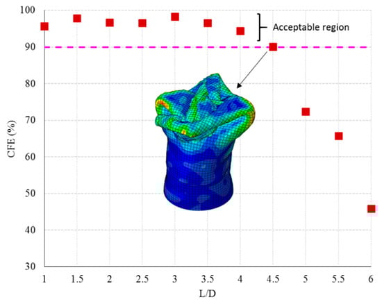 In fact, in this range of aspect ratios, a critical length was not observed, and to find these factors the test should be continued for higher aspect ratios. To discover the critical length, the FE model was extended for a higher aspect ratio and the critical aspect ratio was found. The criterion to find critical length was calculated by CFE. Figure 8 shows the relationship of the L/D to the CFE. It shows that by increasing the length of the tube the crash force efficiency dropped significantly when the L/D was higher than 4.5. In this case, the progressive collapse cannot be seen and the tube acts as an unsteady collapsed column.