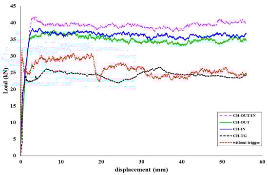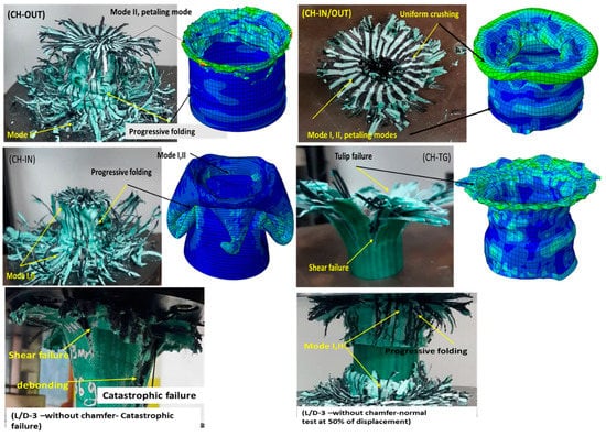 The trigger mechanism provides a region with regulator stress concentration points where structural failure is partial. Therefore, damage can be steadily propagated over the tube length consistently. The crumpling of materials is one of the suitable modes of failure because this process breaks down more fibre and destroys a lot of the matrix. In fact, grinding the fibre and matrix together is the best form of progressive collapse. Four different geometries for the crash initiator mechanism (trigger) were used and the results were taken from the compression testing machine. For each geometry, an FE model was generated, and the experimental testing conditions were applied to the FE model. Figure 9 compares the load-displacement curves of different trigger mechanisms with a normal specimen. This figure shows the deformed specimens after 70% deformation of the initial length. The figure also depicts the deformed shapes of the experimental tests and FE simulations for (CH- OUT), (CH-IN), (CH-IN/OUT), and (CH-TG). The applied continuum damage mechanism (Hashin model) simulated failure modes for each geometry.