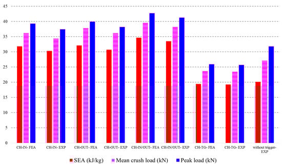Figure 10 compares the results of the experimental test with FE results regarding the three main crashworthiness indicators. The results show that using different trigger mechanisms affects the load-displacement curve significantly. In some cases, the trigger mechanism can create some negative points in terms of energy absorption. The most effective trigger mechanism was the CH-IN/OUT shape and the worst was CH-TG. It can be said that before applying the trigger mechanism to a crash box the geometry should have been justified earlier. In other words, selecting the best geometry can increase the crashworthiness capacity by more than 35%. On the other hand, using inappropriate triggers may reduce the crashworthiness capability by 15%.
