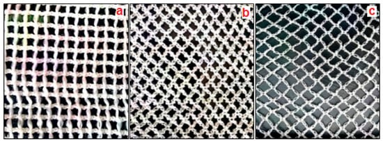 - Liu, X.M.; Jiang, J.H.; Chen, N.L.; Feng, X.W. Effect of manufacturing parameters on the tensile properties and yarn damage of glass fiber warp-knittedted net preforms. J. Ind. Text. 2009, 38, 233–249. [Google Scholar] [CrossRef]