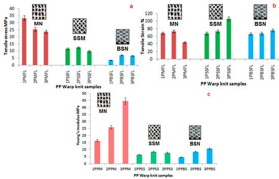 - Among the three warp knitted fabrics, marquisette net fabric possesses higher tensile properties than the sandfly net fabrics due to straight alignment of yarns in the fabrics. Also, the warp knitted fabrics possess good tensile strain properties due to the nature of its structure. For the 93 tex samples, big sandfly net has the highest tensile strain value of 98.4%, which is 61% higher than the 93 tex PP marquisette and 22% higher than 93 tex PP small sandfly warp knitted fabrics. Furthermore, small sandfly net exhibit higher tensile strain than the marquisette structure due to the geometry of filament arrangement in the fabric.