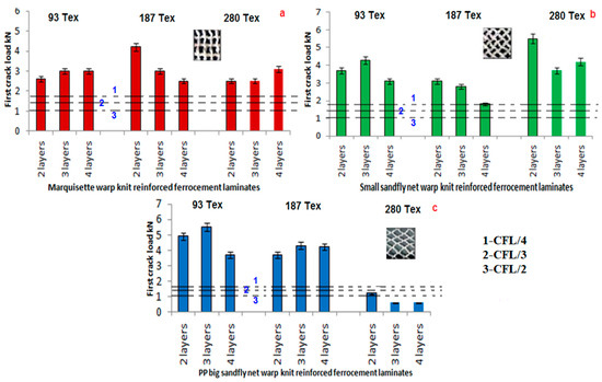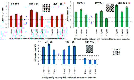 - First crack load of sandfly structure is better than the marquisette structure. The reason is due to the diagonal positioning of yarns in the structure. Among the two sandfly net, big mesh has better first crack load than the small sandfly net due to better cement mortar penetration. The same phenomenon reflects in the ultimate load of the composites also.