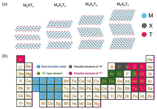 (a) Schematic structure of MXenes. (b) M, A, X, and T elements for MAX and MXene (Reprinted with permission from Ref. [28]. Copyright 2021, copyright Wiley-VCH).