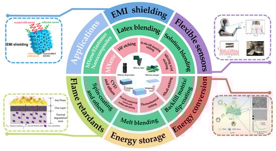 Available preparation methods for MXenes and preparation methods for and applications of MXene/elastomer nanocomposites. (The image of EMI shielding: Reprinted with permission from Ref. [16]. Copyright 2019, copyright Elsevier. The image of flexible sensors: Reprinted with permission from Ref. [29]. Copyright 2021, copyright Wiley-VCH. The image of energy storage and conversion: Reprinted with permission from Ref. [30]. Copyright 2021, copyright Elsevier. The image of flame retardants: Reprinted with permission from Ref. [31]. Copyright 2019, copyright Elsevier).