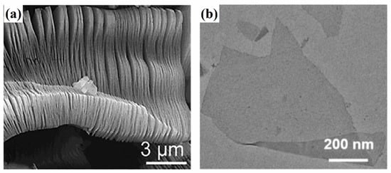 In 2011, Nguib et al. [9] found that aluminum in Ti3AlC2 can be dissolved completely when Ti3AlC2 of a MAX phase reacts with hydrofluoric acid (HF), occasionally obtaining Ti3C2Tx, which was the first 2D MXene to be synthesized while searching for substances resistant to HF corrosion. As a common method, HF etching mixes MAX phase with HF, obtaining MXene by etching elements A. A higher HF concentration results in a shorter reaction time but higher toxicity and stronger corrosion, which is inconvenient for production and results in numerous structural defects in the materials. In addition, the interface state and hydrophilicity of materials can be altered by excessive -F. After etching, the excess acid and by-products should be cleaned and the pH should be regulated to approximately 6 by separating the multilayer MXene from the acid solution by repeated centrifugal washing. MXene exhibits an accordion-like multilayer structure (Figure 3a), and single-layer MXene (Figure 3b) is generally used for experimental materials. However, it is difficult to strip monolithic MXene mechanically, it being necessary to insert an intercalation agent between layers for ultrasonic stripping and delamination. Organic solvents are often used as intercalators, such as dimethyl sulfoxide [32] and tetramethylammonium hydroxide [33], resulting in slices with approximate thicknesses ranging from hundreds of nanometers to several micrometers.