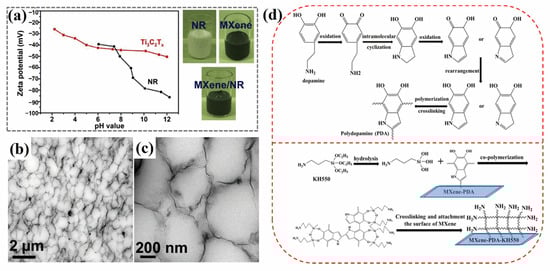 (a) Negative Zeta potentials of Ti3C2Tx suspensions and NR latex (Reprinted with permission from Ref. [20]. Copyright 2019, copyright Elsevier). (b,c) Transmission electron microscopy images of the network structure of MXene/NR (Reprinted with permission from Ref. [20]. Copyright 2019, copyright Elsevier). (d) Diagram of reaction of dopamine self-polymerization on surface of MXene and grafting of KH550 (Reprinted with permission from Ref. [46]. Copyright 2021, copyright Elsevier).