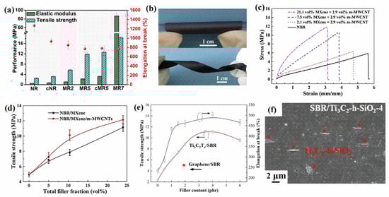 Aakyiir et al. [48] prepared MXene/NBR composites by latex blending. The tensile strengths of the composites increased from 11 to 21 MPa (7.5 vol% MXene), and the elongation at break increased from 500% to 640% (3.9 vol% MXene). In addition, the Young’s moduli increased from 2 to 13 MPa (14.0 vol% MXene). The significantly enhanced tensile strengths and Young’s moduli of the composites were attributed to the monolayer MXene materials having strengths and moduli comparable to those of graphene oxide and molybdenum disulfide. Furthermore, the surface groups of MXene can form hydrogen bonds and other forces with the NBR macromolecules. Aakyiir et al. [59] also prepared MXene/CNT/NBR composites after electrostatic assembly of cetyltrimethylammonium bromide (CTAB)-modified multi-walled CNTs (fixed amount of 2.9 vol%) with MXene. The surface modification increased the compatibility between nanofillers and NBR and promoted the interaction between hybrid fillers and elastomeric macromolecules, resulting in nanocomposites containing MXene/CNT hybrid fillers and achieving significantly higher performance than the same NBR composites under MXene loading (Figure 5c,d).