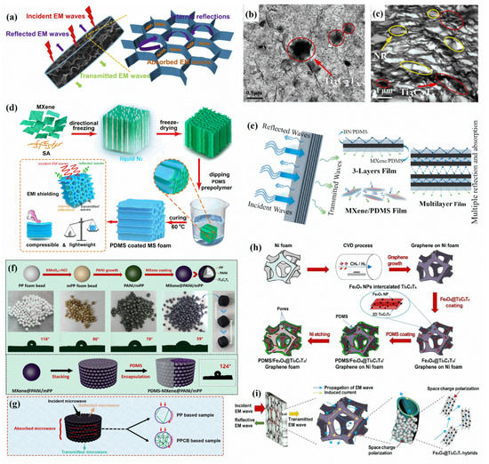 Three-dimensional networks and multilayer structures play significant roles in the absorption of electromagnetic waves, which are suppressed after multiple reflections and scattering in these structures, increasing SEA and reducing the proportion of SER, thus preventing secondary pollution of electromagnetic waves. Wu et al. [16] fabricated MXene/sodium alginate/PDMS foam (Figure 6d) by constructing MXene/sodium alginate aerogel with a directional arrangement and then vacuum backfilling PDMS. With increasing MXene content, the EMI SE and SEA of MXene/sodium alginate aerogel were enhanced, but the SER remained below 5 dB, indicating that it mainly weakened electromagnetic waves through absorption. After dipping into PDMS to form a coating, the SE of foam containing 74.07 wt% MXene was 53.9 dB, and after 500 compression/release cycles at 30% strain, the SE still reached 48.2 dB. Such an excellent performance indicates that PDMS coating strengthens the network structure to withstand compressive loads. Liu et al. [55] prepared MXene/BN/PDMS nanocomposites with an ordered layered structure by alternately spin coating BN/PDMS insulating/thermally conductive layers with MXene/PDMS (10 wt% MXene) conductive layers. With an increasing number of layers, the SER changed less, and the SEA increased significantly. For a nanocomposite film with 11 layers, the SE reached 35.2 dB. After the incident electromagnetic wave directly penetrated the BN layer, part of the electromagnetic wave was immediately reflected when it encountered the MXene layer, and the rest of the electromagnetic wave entered the multilayer film, being further attenuated by multiple reflections and absorptions between conductive layers (Figure 6e). Jia et al. [63] prepared MXene@polyaniline/polypropylene foam (MXene@PANI/PP), which PP foam microbeads treated by oxidation, PANI and MXene were arranged and stacked in a mold cylindrical, and sequentially immersed MXene@PANI/PP in PDMS (Figure 6f). When the MXene content reached approximately 0.0449 vol%, the SE of the PDMS/MXene@PANI/PP with a thickness of 12 mm increased from approximately 8 to 39.8 dB. Hence, the conductive interface generated between adjacent foam beads enhanced the internal 3D network, resulting in multiple reflections and absorptions of electromagnetic waves between the interfaces inside the material, indicating the importance of a 3D conductive network constructed by encapsulation (Figure 6g). Jia et al. [66] mixed CTAB-modified Ti3C2Tx with shape-memory elastomer 1, 4-trans polyisoprene by solution blending and immersed the compressible carbon foam backbone in a solution for coating the surface. The SE of 1, 4-trans polyisoprene/carbon foam with a thickness of about 10 mm in the X-band reached 25.3 dB, and, after adding CTAB-MXene, the SE of the composite containing 20 wt% CTAB-MXene increased to 44.7 dB. This composite material exhibited excellent thermal/electrically stimulated shape-memory behavior that allowed tuning of the EMI shielding properties under self-fixing mechanical deformation.