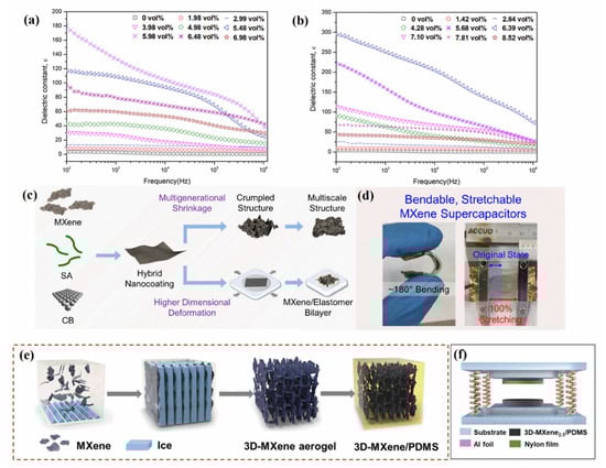 Dielectric constant of (a) Ti3C2Tx/AE and (b) PANI-Ti3C2Tx/AE (Reprinted with permission from Ref. [76]. Copyright 2021, copyright Elsevier). (c) Schematic of fabrication of high-areal-capacitance electrodes and highly bendable and stretchable supercapacitors (Reprinted with permission from Ref. [77]. Copyright 2018, copyright ACS). (d) The MXene/elastomer electrodes for bendable, stretchable supercapacitors (Reprinted with permission from Ref. [77]. Copyright 2018, copyright ACS). (e) Schematic of fabrication of 3D-MXene/PDMS (Reprinted with permission from Ref. [78]. Copyright 2019, copyright Elsevier). (f) Schematic of 3D-MXene/PDMS-based TENG (Reprinted with permission from Ref. [78]. Copyright 2019, copyright Elsevier). (SA: sodium alginate; CB: carbon black nanoparticle).