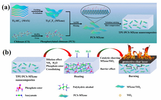 (a) Illustration of the preparation and (b) possible flame-retardant mechanism of TPU/PCS-MXene nanocomposites (Reprinted with permission from Ref. [80]. Copyright 2022, copyright Elsevier).