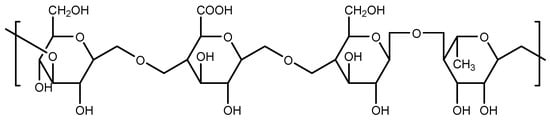 Several biomedical researchers have reported various forms of wound dressings that are based on polymer gums. The word ‘’Gum’’ is used to describe a group of naturally occurring polymers due to their capability to produce either viscous solution or gel. These polymers are widely studied because of their biodegradable, biocompatible, and sustainable features [52,53]. Among them is gellan gum which is commercially formulated by bacterial exopolysaccharide fermentation from Pseudomonas elodea or Sphingomonas elodea, and it can also be excreted by Sphingomonas paucimobilis but with a lesser yield. This polymer gum possesses negatively charged, linear exopolysaccharides consisting of four repeating carbohydrates in the main chain that includes two D-glucose carbohydrates, one D-glucuronic acid, and one L-rhamnose (Figure 1) [54,55]. Gellan molecules are found in the form of double helices at low temperatures and in the form of random coils at high temperatures. The average molecular weight of gellan gum is approximately 500 kDa [55].