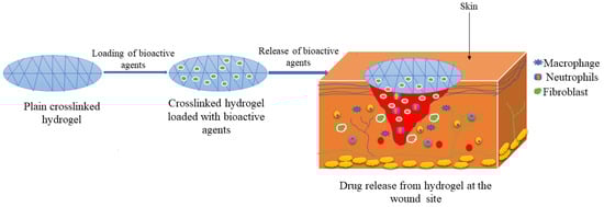 Interactive wound dressings provide a moist environment to accelerate the wound healing process, exhibiting good water vapour transmission, and enhancing granulation and re-epithelization. Examples of interactive dressings include gels, films, membranes, composites, and sprays [36]. Some of these dressings can be loaded with therapeutic agents to produce bioactive wound dressing materials. Bioactive wound dressings, such as sponges, hydrocolloids, foams, wafers, hydrogels, nanofibers, films, and collagens are biocompatible, biodegradable, and can act as drug delivery systems for bioactive agents, such as antibiotics, growth factors (GFs), nanoparticles, and vitamins with the enhanced process of wound healing [37]. Although hydrogels and nanofibers are other kinds of wound dressings, they can be encapsulated with therapeutic agents and exhibit the controlled drug delivery of bioactive agents, making them bioactive wound dressings [38].